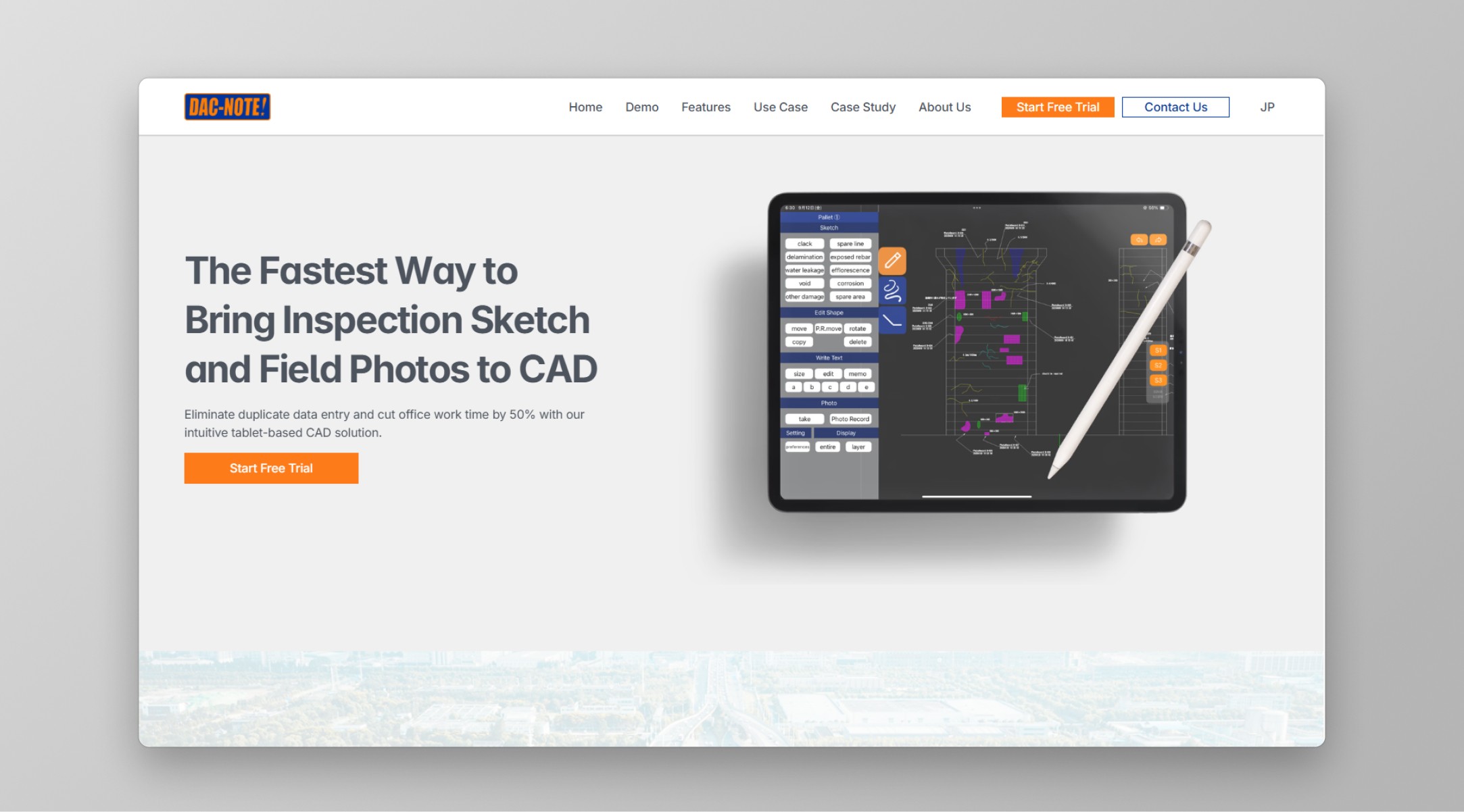 DAC-NOTE is a tablet-based CAD application designed to streamline on-site infrastructure inspections for field engineers working on bridges, tunnels, and dams. The product was originally developed in Japan by a former field engineer and had strong real-world utility, but all product information, branding, and sales materials existed only in Japanese.